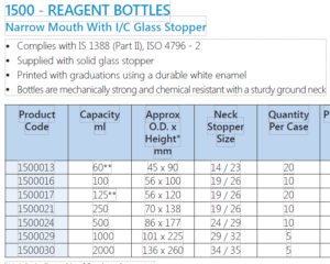 BOROSIL 1500 REAGENT BOTTLES Narrow Mouth With I/C Glass Stopper